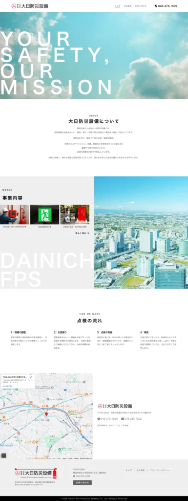 横浜市の消防・防災設備点検や工事を行う「大日防災設備」の公式サイトを制作しました。地域密着の信頼感が伝わる構成・デザインに仕上げています。